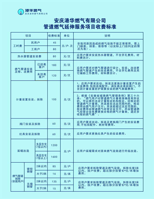 隨著安慶城市燃?xì)饨ㄔO(shè)的快速發(fā)展,人民群眾生活水平的提高,在保障了用戶基本用氣需求的前提下,燃?xì)庥脩魧?duì)管道燃?xì)獾难由旆?wù)有了更多更高的要求。為滿足用戶的個(gè)性化需求,我司按照“國(guó)辦函〔2020〕129號(hào)”文件精神,結(jié)合實(shí)際情況和市場(chǎng)同類服務(wù)標(biāo)準(zhǔn),按照用戶自愿、有償服務(wù)、合理收益、便于操作的原則,制定了以下延伸服務(wù)收費(fèi)標(biāo)準(zhǔn),定于2021年9月6日起執(zhí)行。