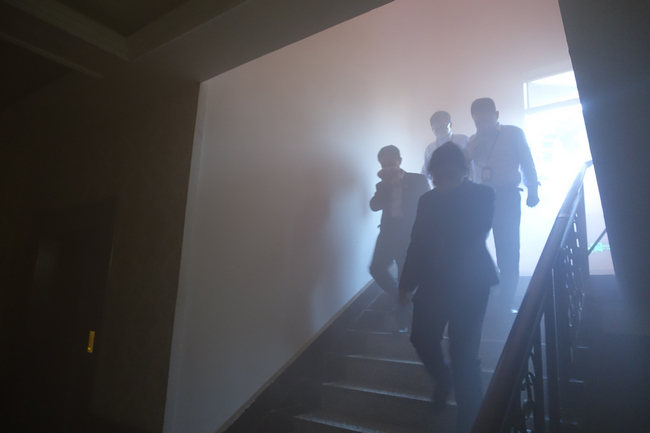 下午15:30分,隨著警報(bào)響起,各樓層疏散組長(zhǎng)迅速行動(dòng),及時(shí)引導(dǎo)各層員工沿逃生疏散路線有序撤離。全體員工依照預(yù)案要求,用濕毛巾捂住口鼻快速前進(jìn),僅用了5分鐘即安全撤離到公司大樓警戒線外的安全地帶。隨即,各樓層疏散組長(zhǎng)清點(diǎn)人數(shù)后向演練總指揮報(bào)告疏散情況,整個(gè)應(yīng)急疏散過(guò)程,秩序良好,反應(yīng)迅速。
