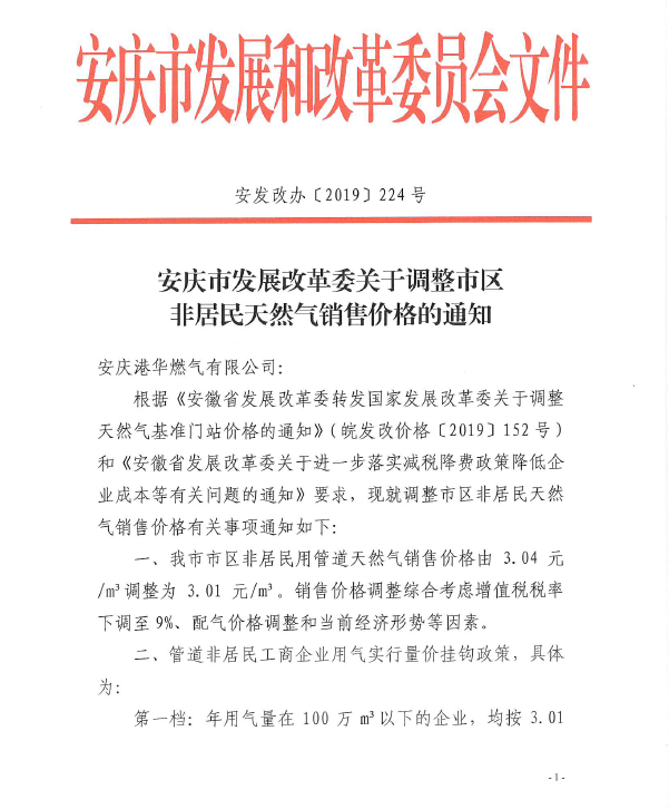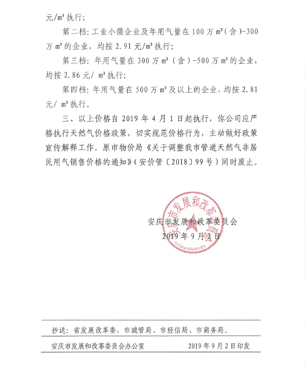 安慶市發(fā)展改革委關于調整市區(qū)非居民天然氣銷售價格的通知(2019)