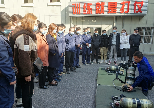 培訓(xùn)中,消防特勤中隊(duì)教官詳細(xì)講解了各消防器材的種類、性能、適用火種和操作要領(lǐng),重點(diǎn)演示了干粉滅火器的使用、消防服和空氣呼吸器的穿戴以及消防水帶的使用等,并現(xiàn)場(chǎng)指導(dǎo)港華員工依次進(jìn)行滅火相關(guān)實(shí)操練習(xí)。