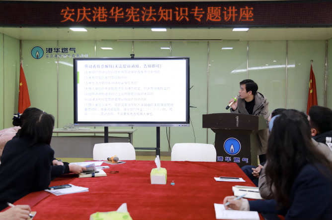 組織20余名員工代表開展憲法專題講座,以《中華人民共和國憲法》《勞動法》《城鎮(zhèn)燃氣管理條例》及誠信合規(guī)相關法律法規(guī)的解讀和案例詳解為主要內(nèi)容,進行法律宣講。