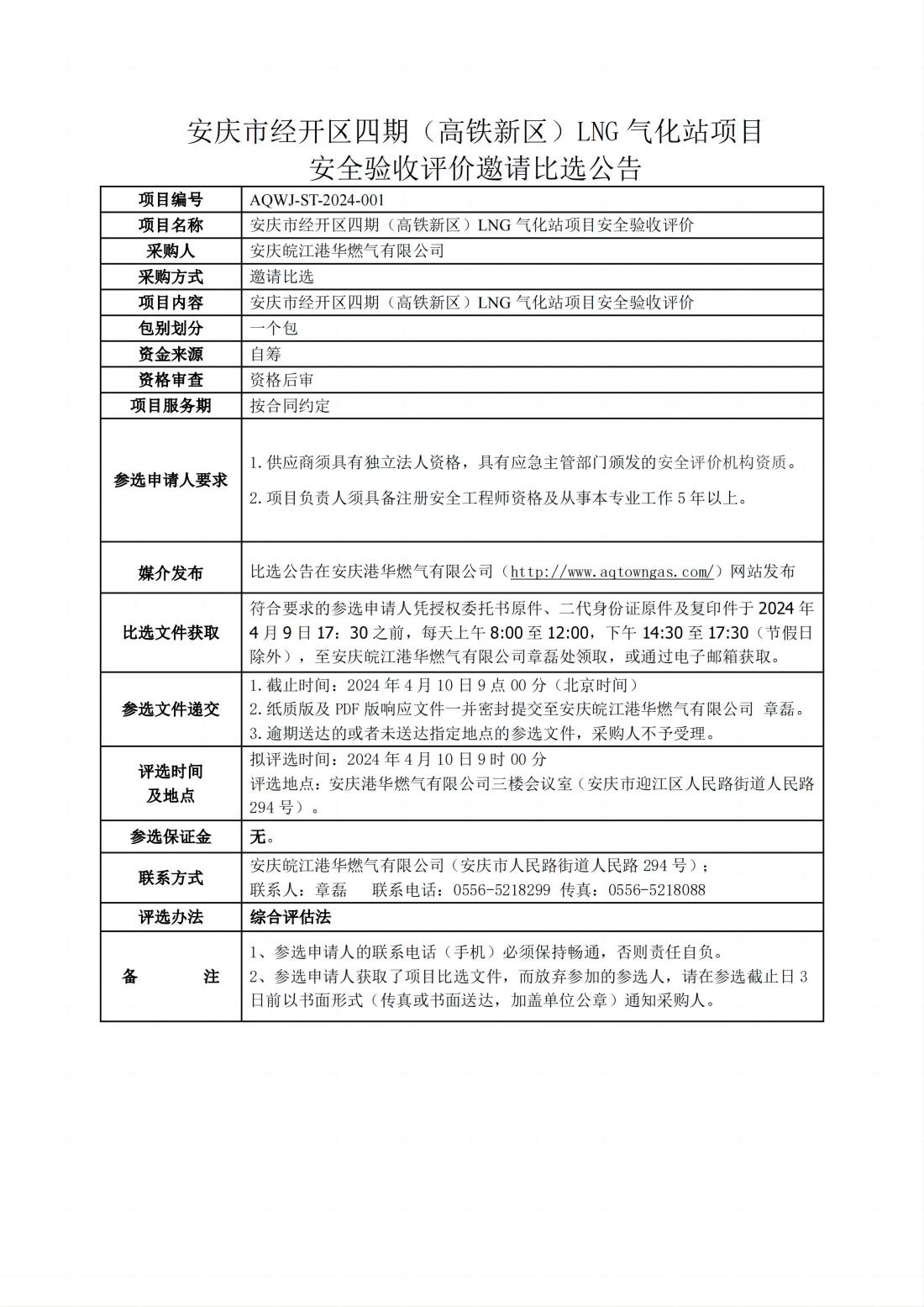 安慶市經開區(qū)四期(高鐵新區(qū))LNG 氣化站項目安全驗收評價邀請比選公告
