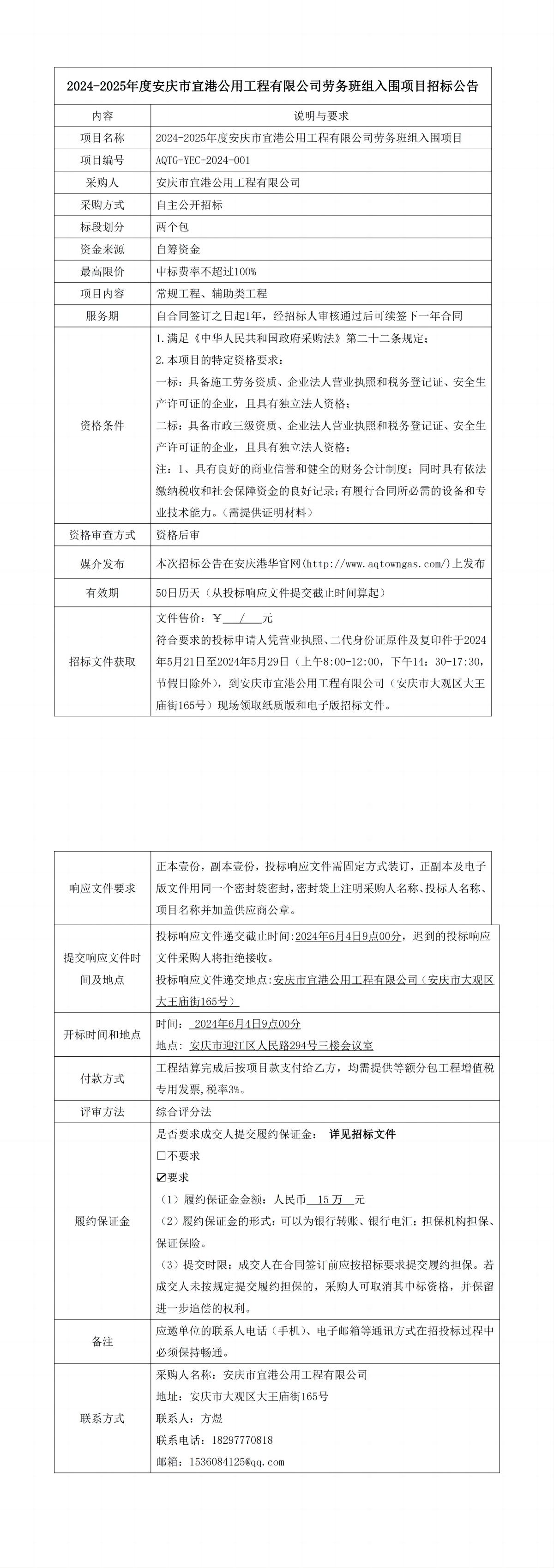 2024-2025年度安慶市宜港公用工程有限公司勞務(wù)班組入圍項目招標公告
