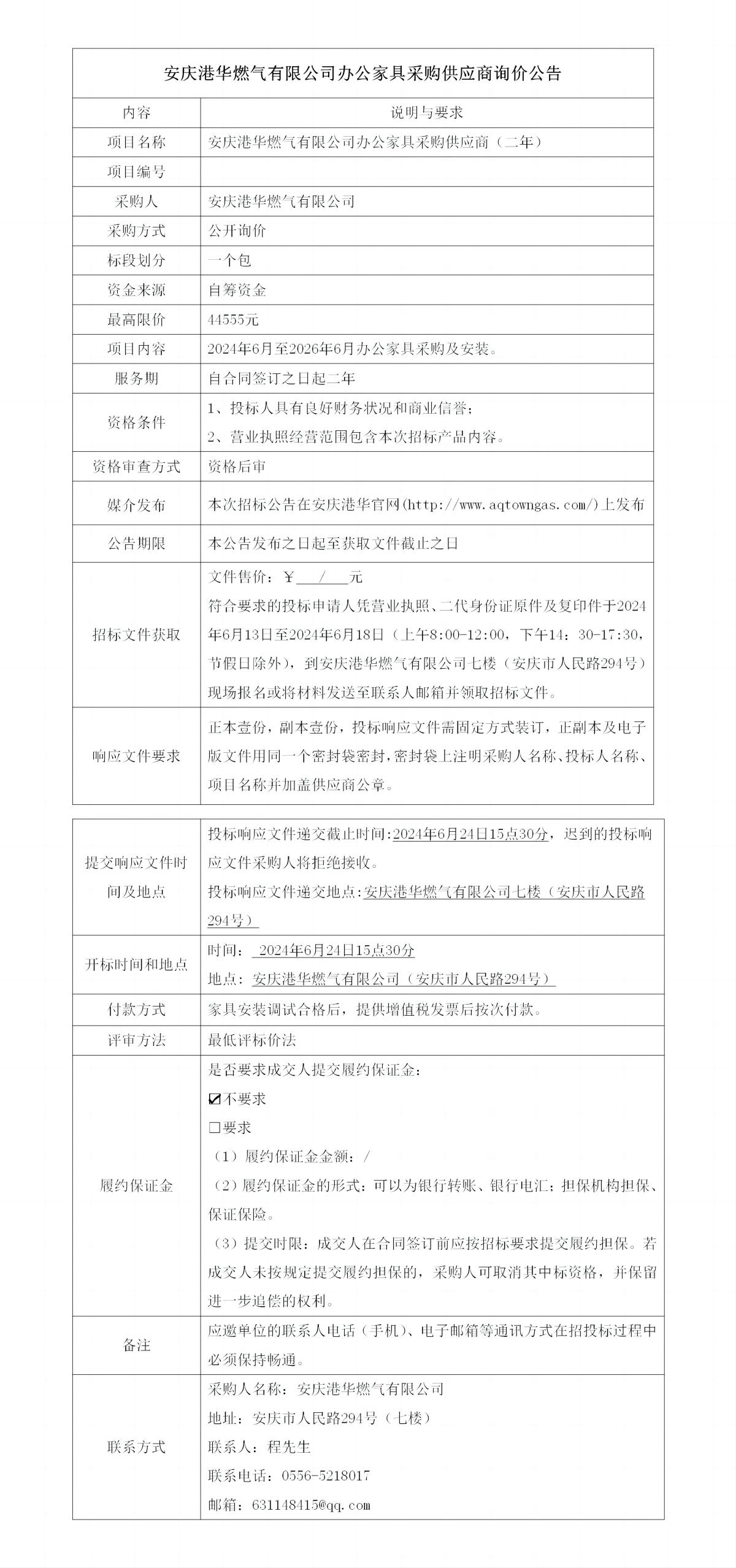 安慶港華燃?xì)庥邢薰巨k公家具采購供應(yīng)商詢價公告