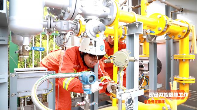 下午14:30,隨著公司黨委書記、董事長程志求一聲令下,演練正式開始。本次演練模擬了廠區(qū)內(nèi)調(diào)壓柜放散管傾倒,調(diào)壓柜內(nèi)泄漏燃氣值處于爆炸極限內(nèi),公司在接到報警后,第一時間依據(jù)GIS系統(tǒng)對事故進行預判,同時派出工商搶險組與綜合應急搶險隊趕赴現(xiàn)場,迅速開展人群疏散、調(diào)壓柜搶修、復壓恢復供氣等一系列救援行動。通過各組之間的快速響應和有效處置,險情得到有效控制,第一時間完成了搶修工作,并確認具備恢復供氣條件后,及時為用戶恢復供氣。