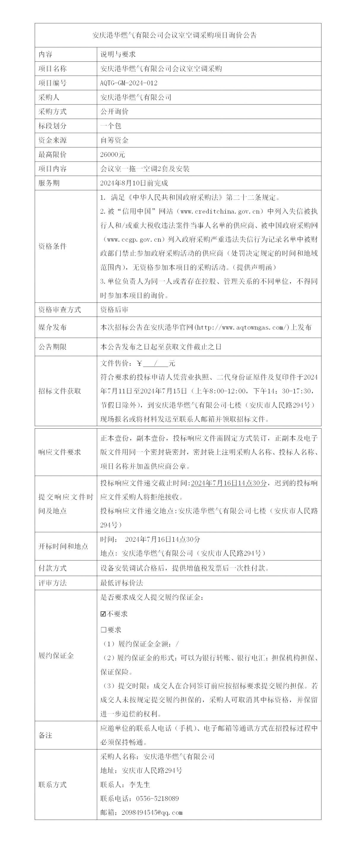 安慶港華燃?xì)庥邢薰緯?huì)議室空調(diào)采購(gòu)項(xiàng)目詢價(jià)公告
