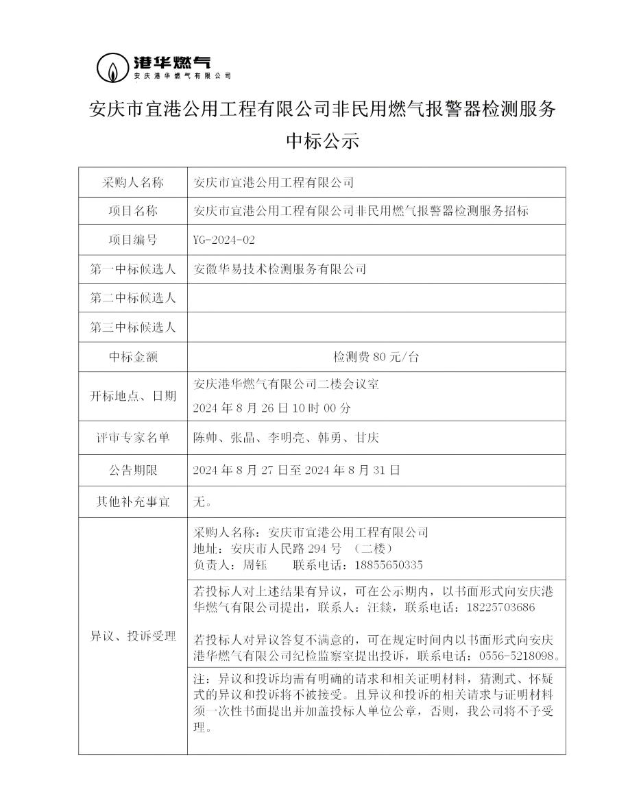 安慶市宜港公用工程有限公司非民用燃氣報警器檢測服務中標公示
