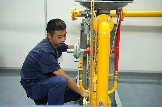 本次競賽分為理論考試和實操競賽兩大部分,內(nèi)容涵蓋技術(shù)方案編制、蒙眼拆裝、工藝系統(tǒng)檢查及故障排除等多項考核內(nèi)容。理論考試主要檢驗參賽選手對燃氣管道調(diào)壓相關(guān)知識的掌握情況,而實操競賽則通過模擬真實工作環(huán)境,全面考察選手的實際操作能力和應(yīng)對突發(fā)情況的能力。在實操競賽中,選手們需要在規(guī)定時間內(nèi)完成蒙眼拆裝切斷閥、排查調(diào)壓器故障并恢復(fù)管道壓力等任務(wù),整個過程需準確無誤的完成144個零件的拆裝,并一次性調(diào)試合格。比賽現(xiàn)場氣氛緊張而熱烈,選手們?nèi)褙炞?、爭分奪秒,展現(xiàn)了燃氣行業(yè)職工良好的職業(yè)素養(yǎng)和團隊協(xié)作精神。