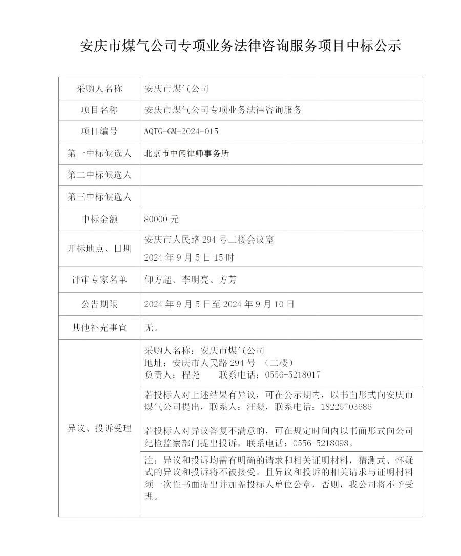 安慶市煤氣公司專項(xiàng)業(yè)務(wù)法律咨詢服務(wù)項(xiàng)目中標(biāo)公示