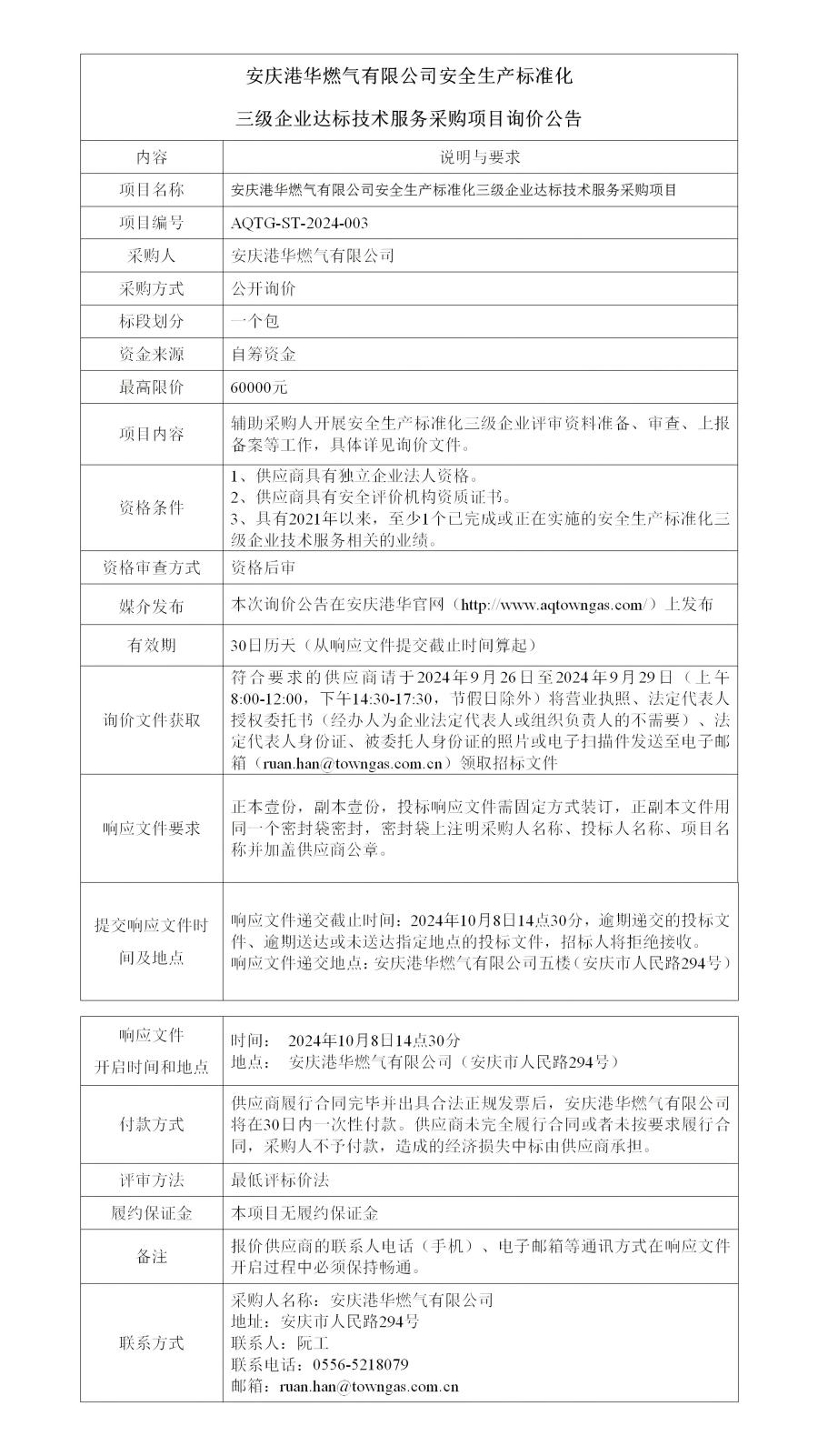 安慶港華燃氣有限公司安全生產(chǎn)標(biāo)準(zhǔn)化三級企業(yè)達標(biāo)技術(shù)服務(wù)采購項目詢價公告