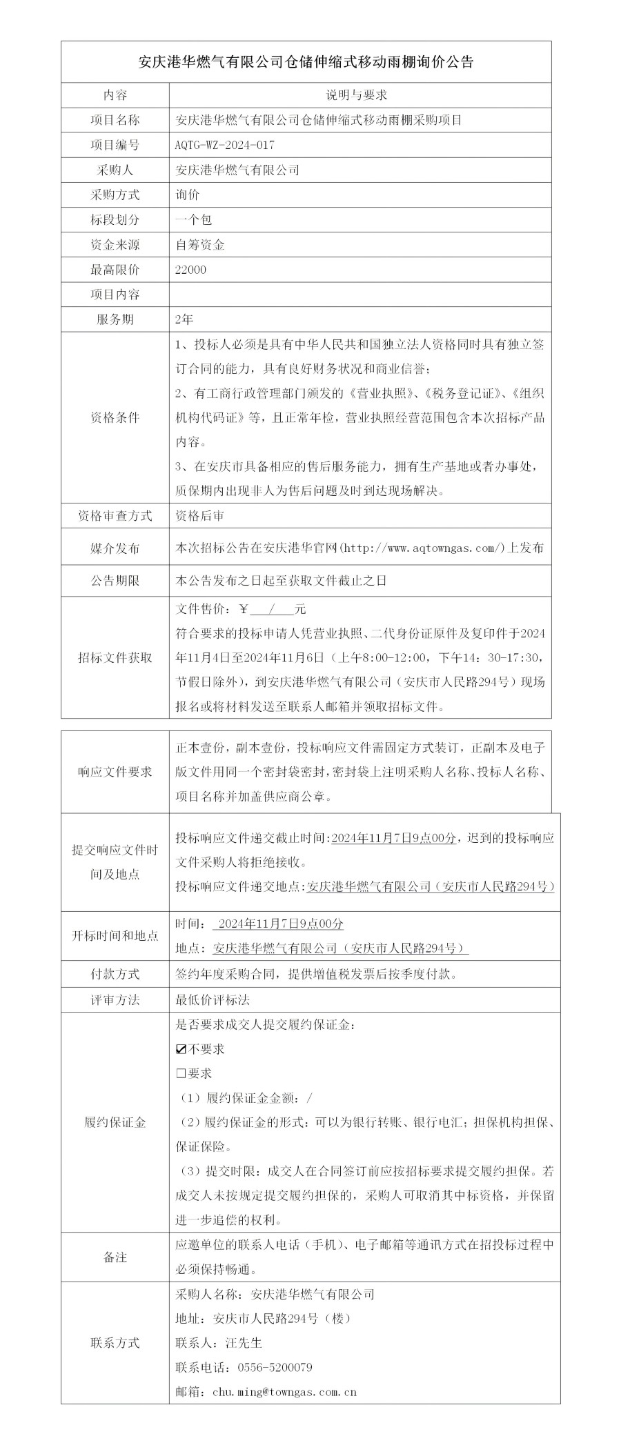 安慶港華燃氣有限公司倉儲伸縮式移動雨棚詢價公告