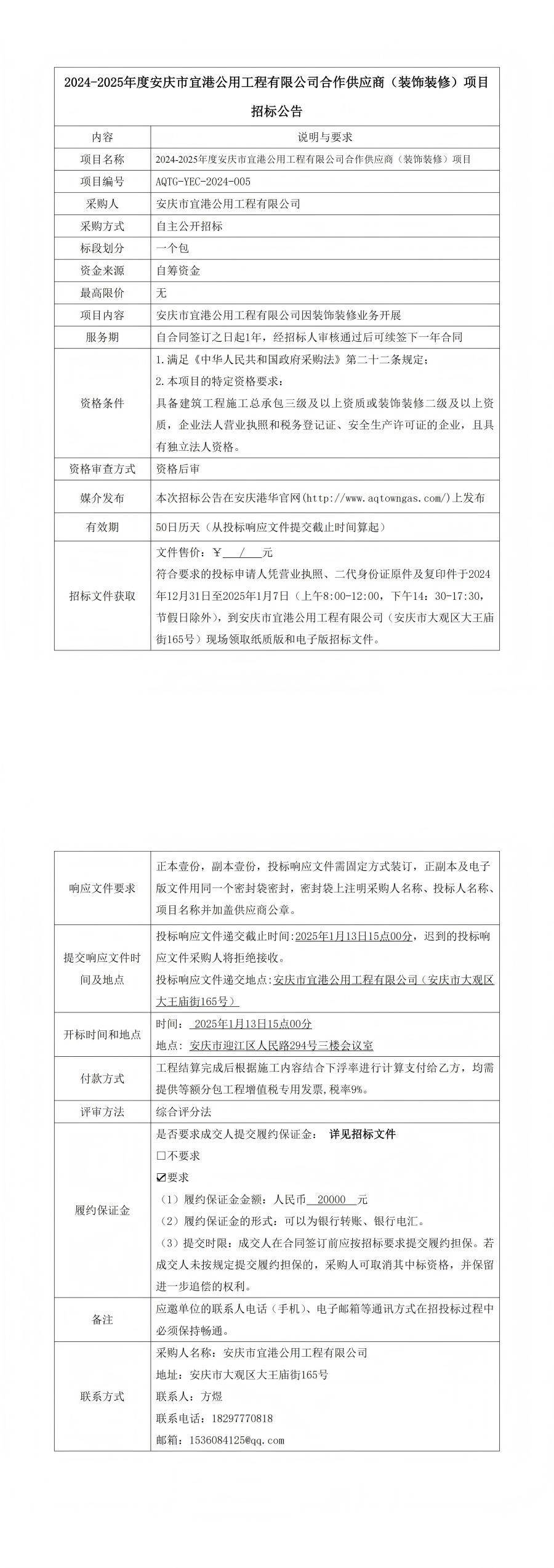 2024-2025年度安慶市宜港公用工程有限公司合作供應商(裝飾裝修)項目 招標公告