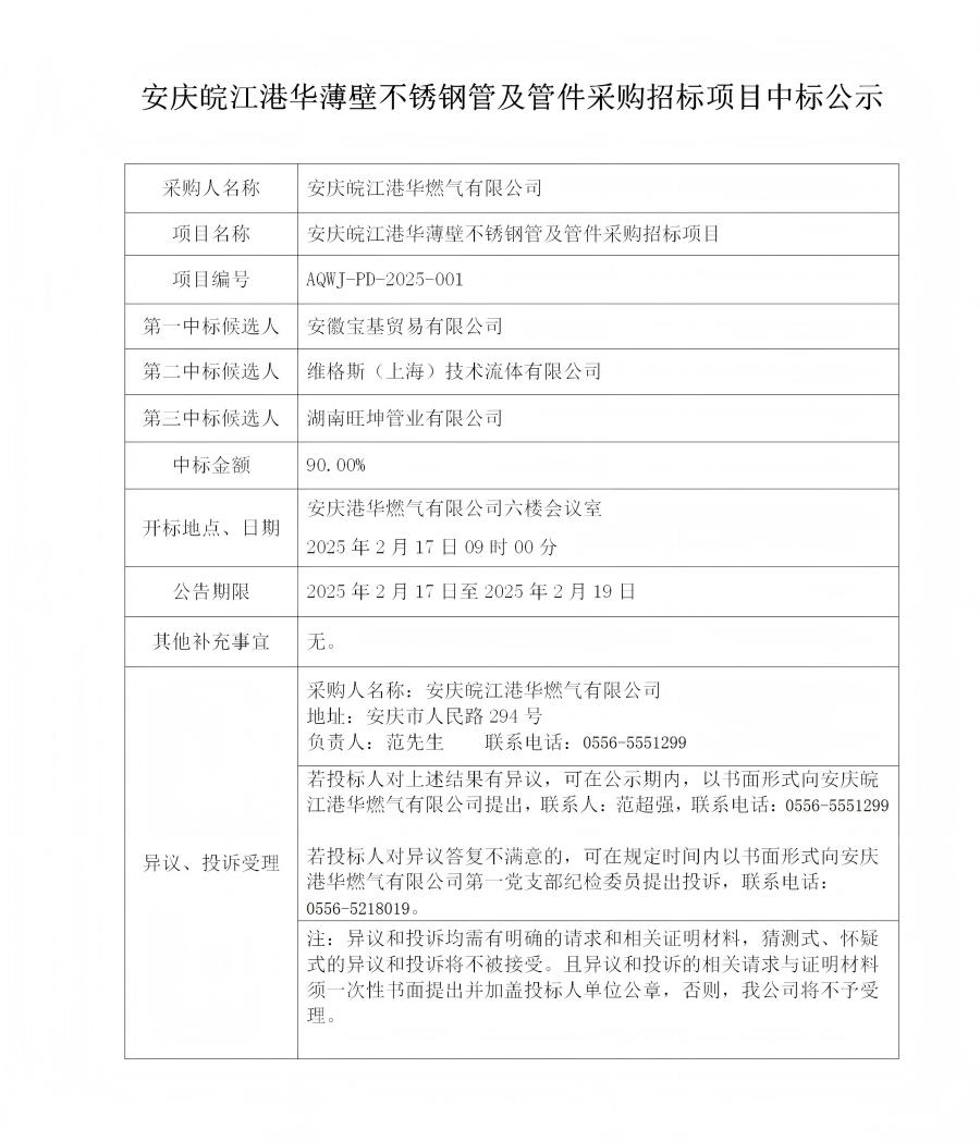 安慶皖江港華薄壁不銹鋼管及管件采購招標(biāo)項目中標(biāo)公示