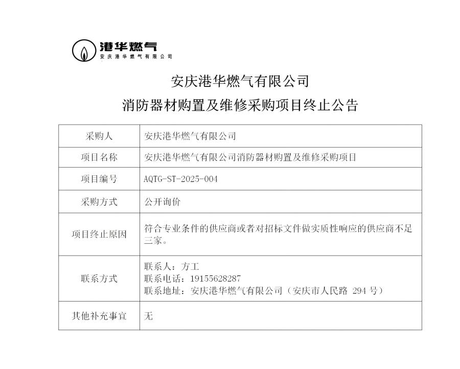 安慶港華燃?xì)庥邢薰鞠榔鞑馁徶眉熬S修采購項目終止公告