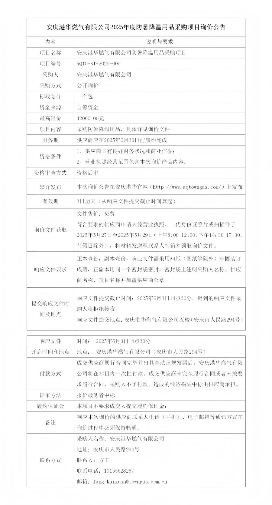 安慶港華燃?xì)庥邢薰?025年度防暑降溫用品采購項(xiàng)目詢價公告