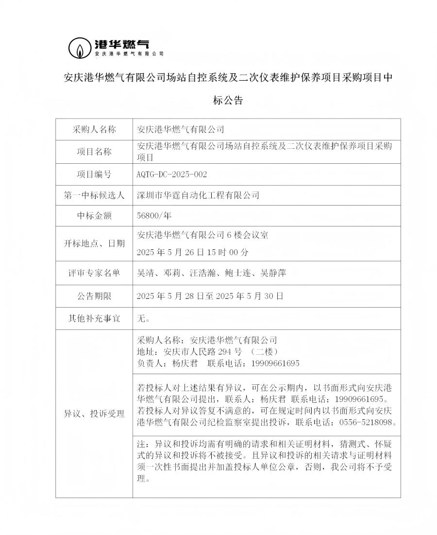 安慶港華燃?xì)庥邢薰緢稣咀钥叵到y(tǒng)及二次儀表維護(hù)保養(yǎng)項目采購項目中標(biāo)公告