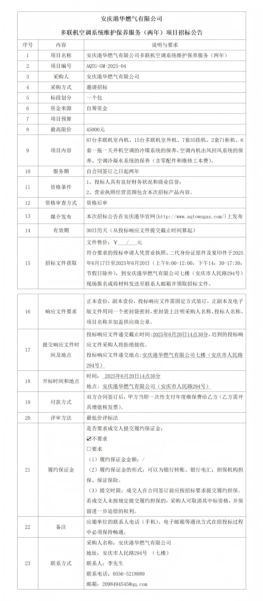 安慶港華燃氣有限公司多聯(lián)機空調系統(tǒng)維護保養(yǎng)服務(兩年)項目招標公告