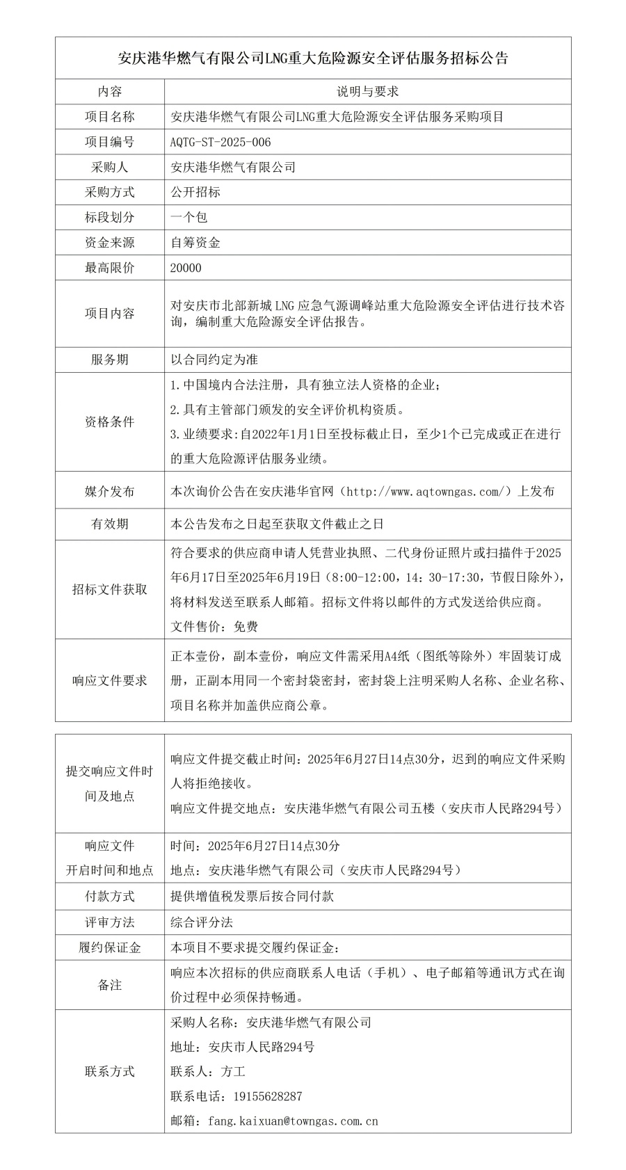 安慶港華燃?xì)庥邢薰綥NG重大危險(xiǎn)源安全評(píng)估服務(wù)招標(biāo)公告
