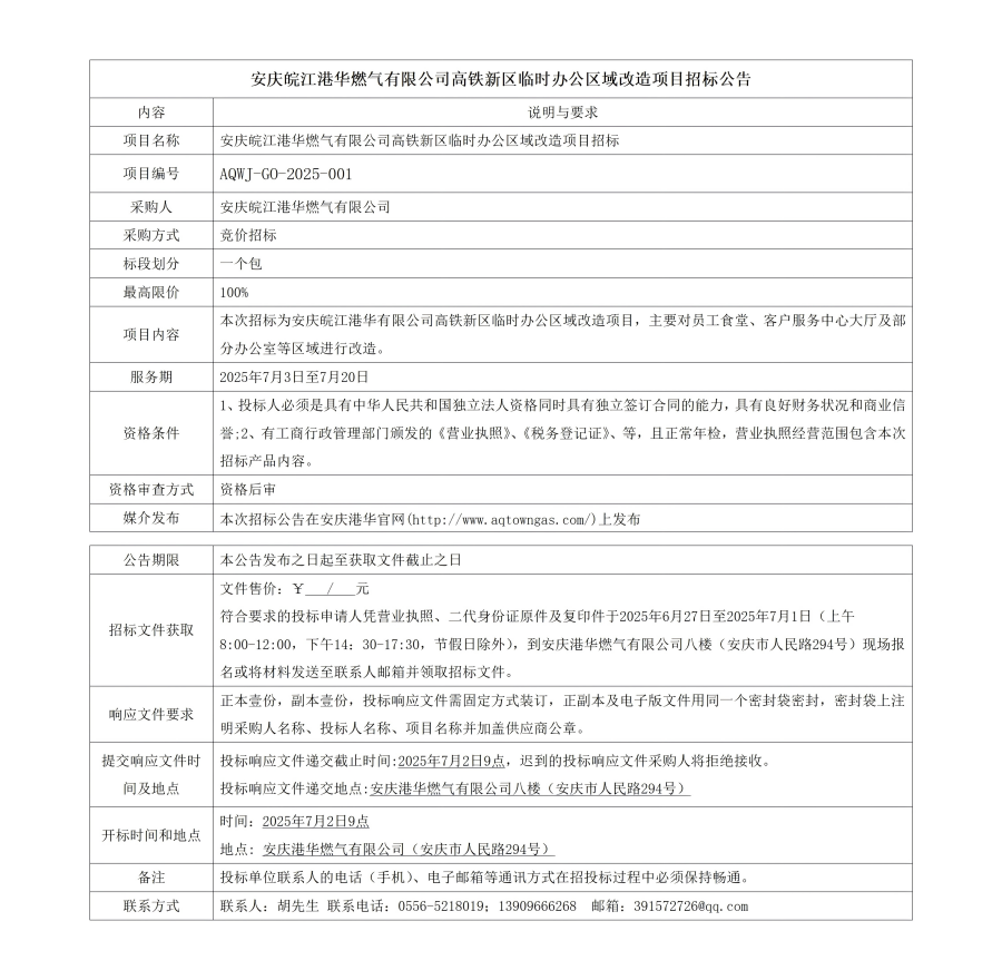 安慶皖江港華燃氣有限公司高鐵新區(qū)臨時辦公區(qū)域改造項目招標公告