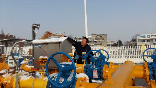 圖為1月23日,LNG釋放站工作人員在進(jìn)行儲罐倒罐作業(yè)、清掃積雪