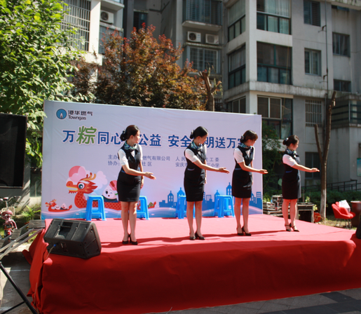 當(dāng)日,安慶港華的義工隊(duì)員和“藍(lán)焰”黨員義工們早早來到炮營山社居委轄區(qū)的諧水灣小區(qū),撐帳篷,搭展臺,搬物料,一場以“包粽子、看演出、講安全、傳文明”為主題的文化大餐陸續(xù)上演?;顒蝇F(xiàn)場熱鬧非凡,不少用戶正在港華燃?xì)獾摹傲鲃臃?wù)車”前排隊(duì)進(jìn)行燃?xì)鈭?bào)裝和繳費(fèi),服務(wù)臺的工作人員一邊發(fā)放著燃?xì)獍踩麄魇謨?,一邊針對居民的用氣問題耐心作答。而廣場正中央搭建的演出舞臺更是吸引不少居民駐足圍觀,安慶港華燃?xì)夂蜕鐓^(qū)居民聯(lián)合打造的精彩紛呈的文藝表演正在進(jìn)行。既有優(yōu)揚(yáng)的港華企業(yè)歌曲,又有優(yōu)雅的服務(wù)禮儀表演;社區(qū)阿姨們的廣場舞,舞出了歡樂,舞出了自信,來自轄區(qū)學(xué)校孩子們有模有樣的黃梅戲表演,讓我們看到了傳統(tǒng)戲曲文化的美好傳承;穿插其間的燃?xì)獍踩R有獎(jiǎng)問答更是引得眾人踴躍參與,掌聲、歡呼聲此起彼伏。而臺下社區(qū)阿姨和港華義工在欣賞精彩文藝演出的同時(shí),還不忘巧手裹粽,不多會,桌上就擺滿了幾百只飄著粽葉香的愛心粽,既弘揚(yáng)了傳統(tǒng)文化,又增進(jìn)了企業(yè)和居民之間的感情,現(xiàn)場呈現(xiàn)出一片文明和諧,奮進(jìn)向上的氛圍。