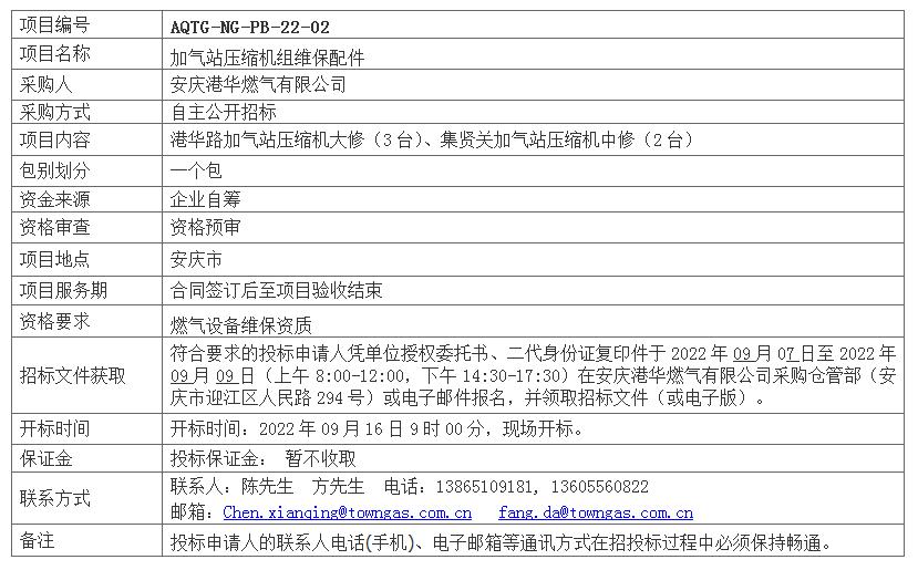 安慶港華天然氣用加氣站壓縮機組維保配件采購招標(biāo)公告