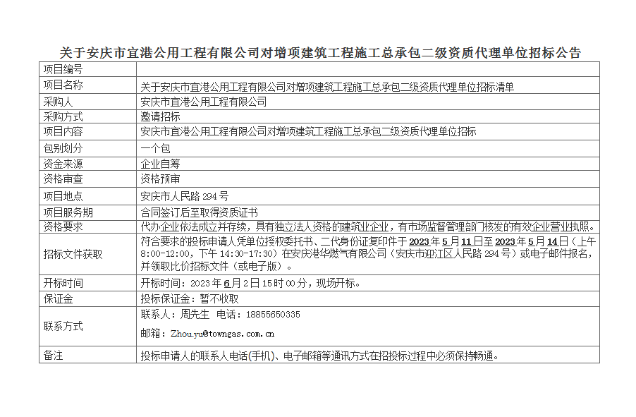 關(guān)于安慶市宜港公用工程有限公司對增項建筑工程施工總承包二級資質(zhì)代理單位招標(biāo)公告