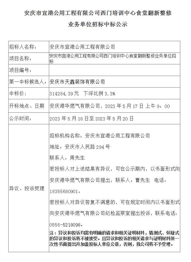 安慶市宜港公用工程有限公司西門培訓(xùn)中心食堂翻新整修業(yè)務(wù)單位招標(biāo)中標(biāo)公示
