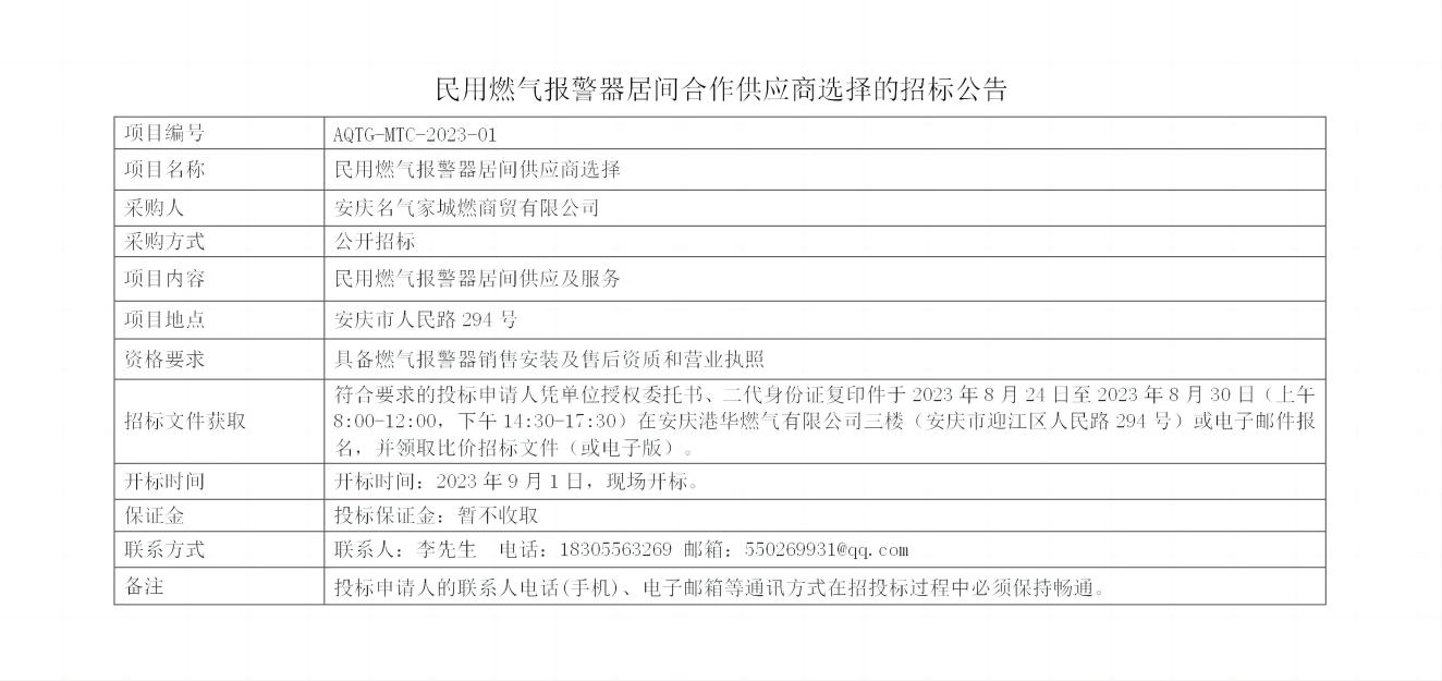 民用燃?xì)鈭?bào)警器居間合作供應(yīng)商選擇的招標(biāo)公告