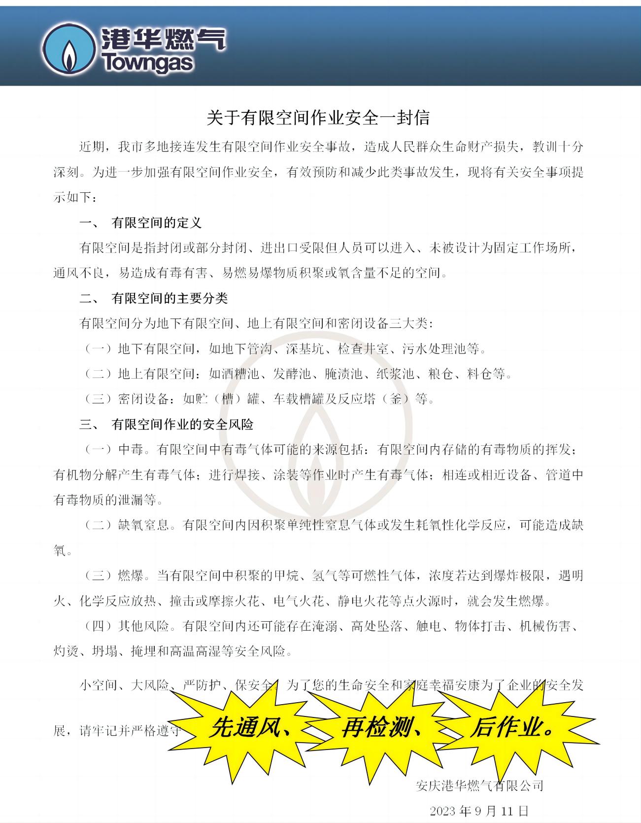 關(guān)于有限空間作業(yè)安全一封信