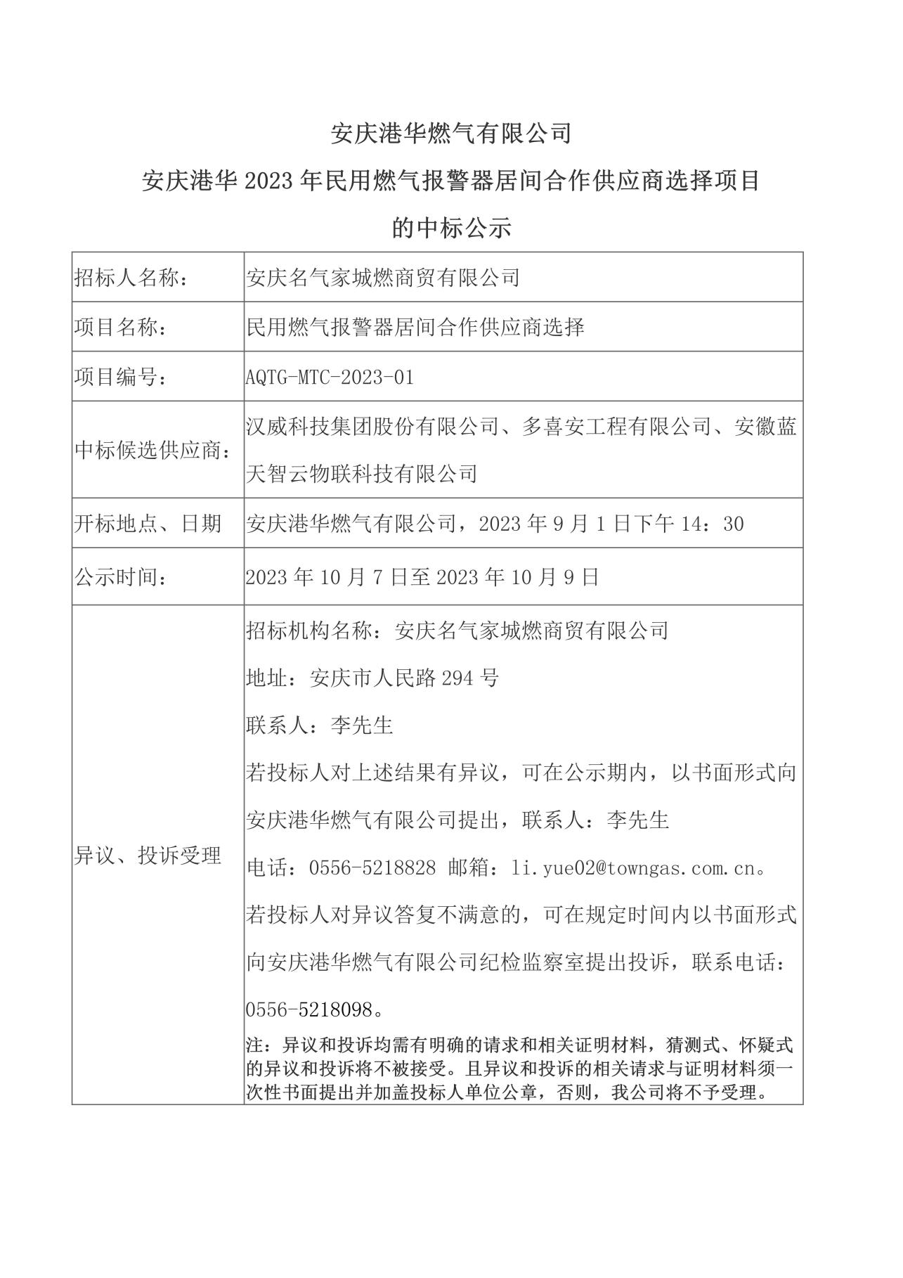 安慶港華燃氣有限公司 安慶港華2023年民用燃氣報警器居間合作供應商選擇項目的中標公示