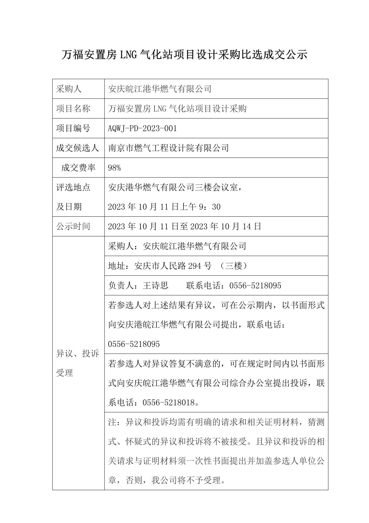 萬福安置房LNG氣化站項(xiàng)目設(shè)計(jì)采購比選成交公示