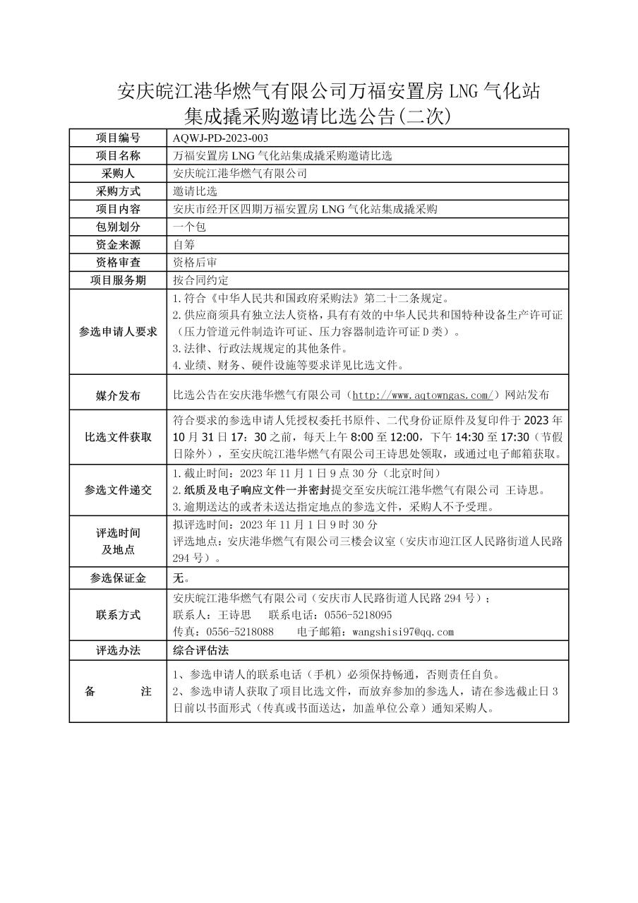 安慶皖江港華燃?xì)庥邢薰救f福安置房LNG氣化站集成撬采購邀請比選公告(二次)
