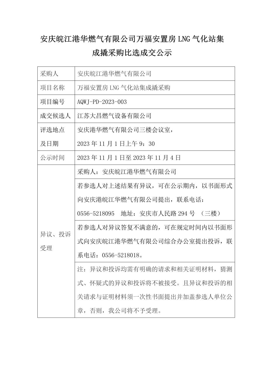 安慶皖江港華燃?xì)庥邢薰救f(wàn)福安置房LNG氣化站集成撬采購(gòu)比選成交公示