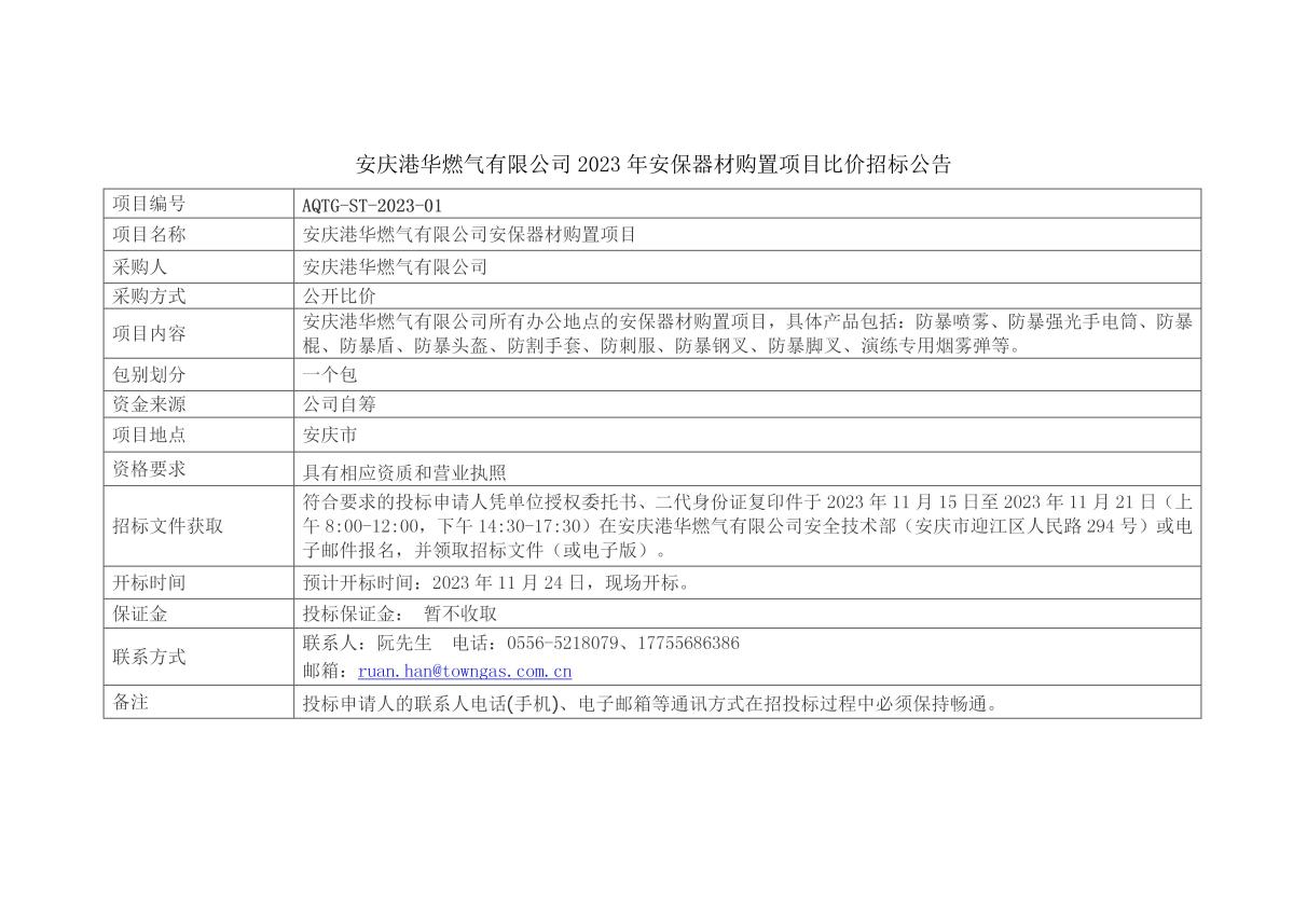 2023安慶港華安保器材購(gòu)置項(xiàng)目比價(jià)招標(biāo)公告