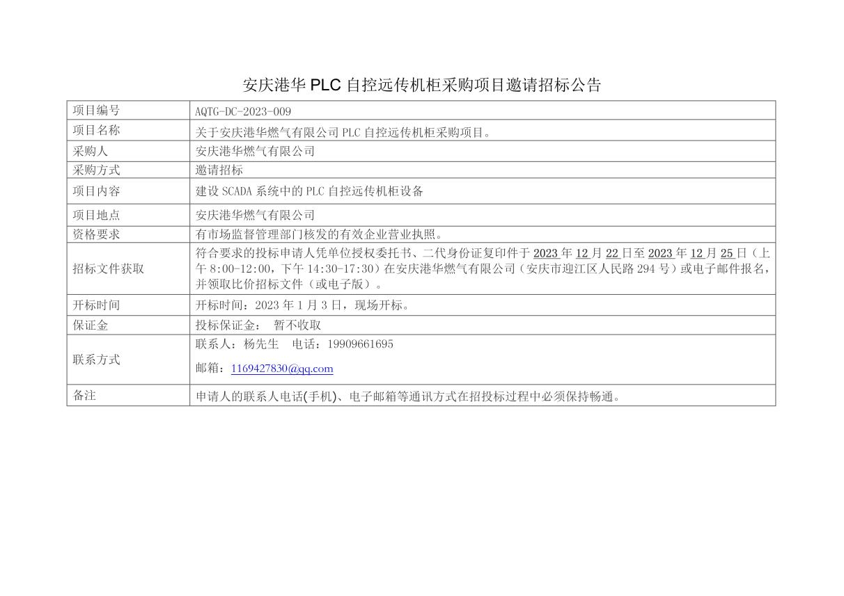安慶港華PLC自控遠傳機柜采購項目邀請招標公告