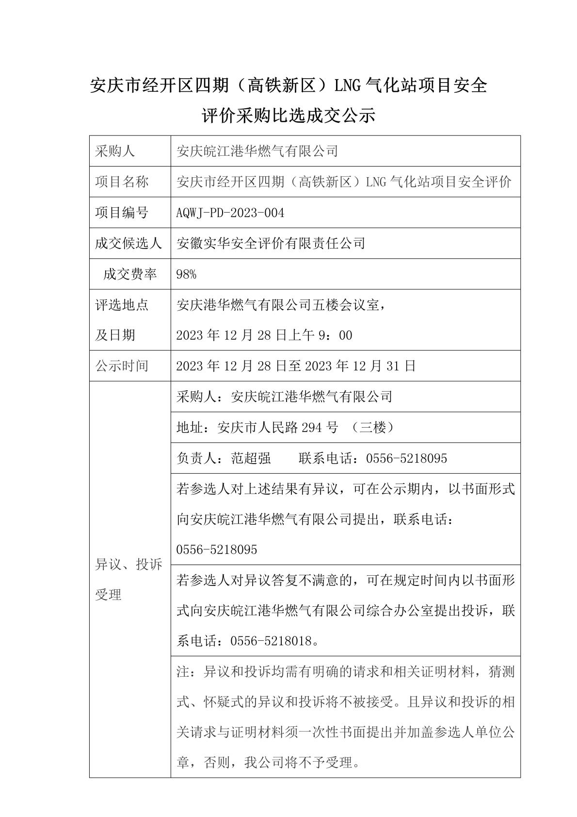 安慶市經(jīng)開區(qū)四期(高鐵新區(qū))LNG氣化站項(xiàng)目安全評價(jià)采購比選成交公示