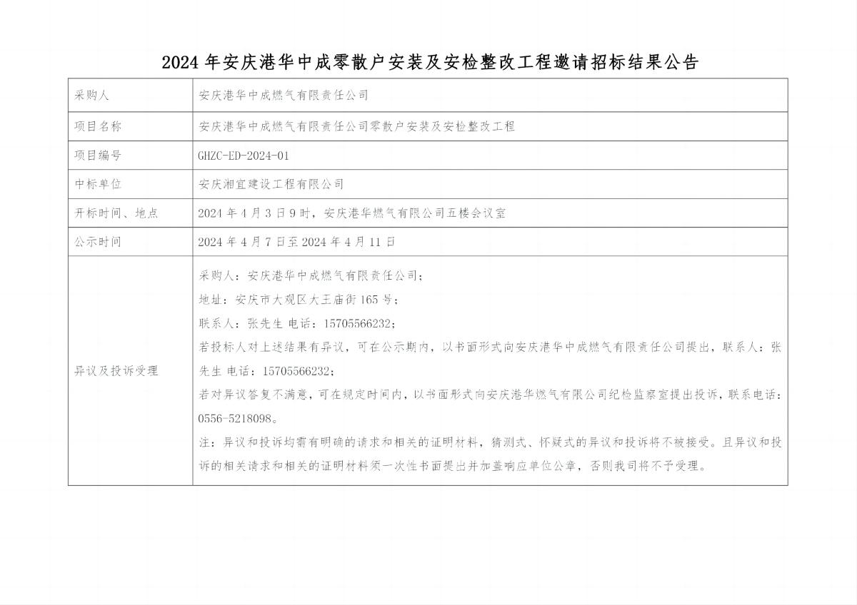 2024年安慶港華中成零散戶安裝及安檢整改工程邀請招標結果公告