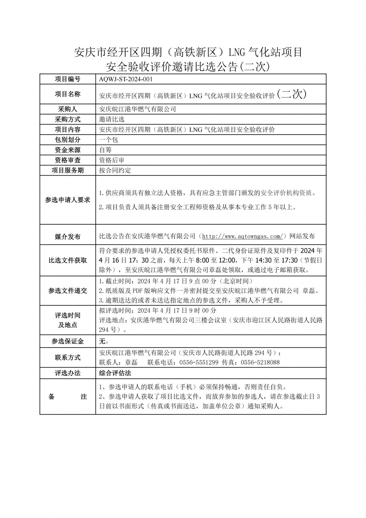 安慶市經(jīng)開區(qū)四期(高鐵新區(qū))LNG 氣化站項(xiàng)目 安全驗(yàn)收評價(jià)邀請比選公告(二次)