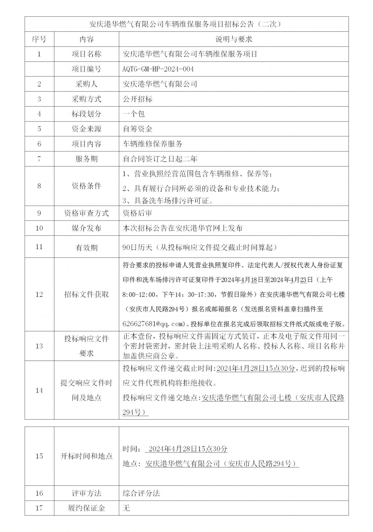 安慶港華燃氣有限公司車輛維保服務項目招標公告(二次)