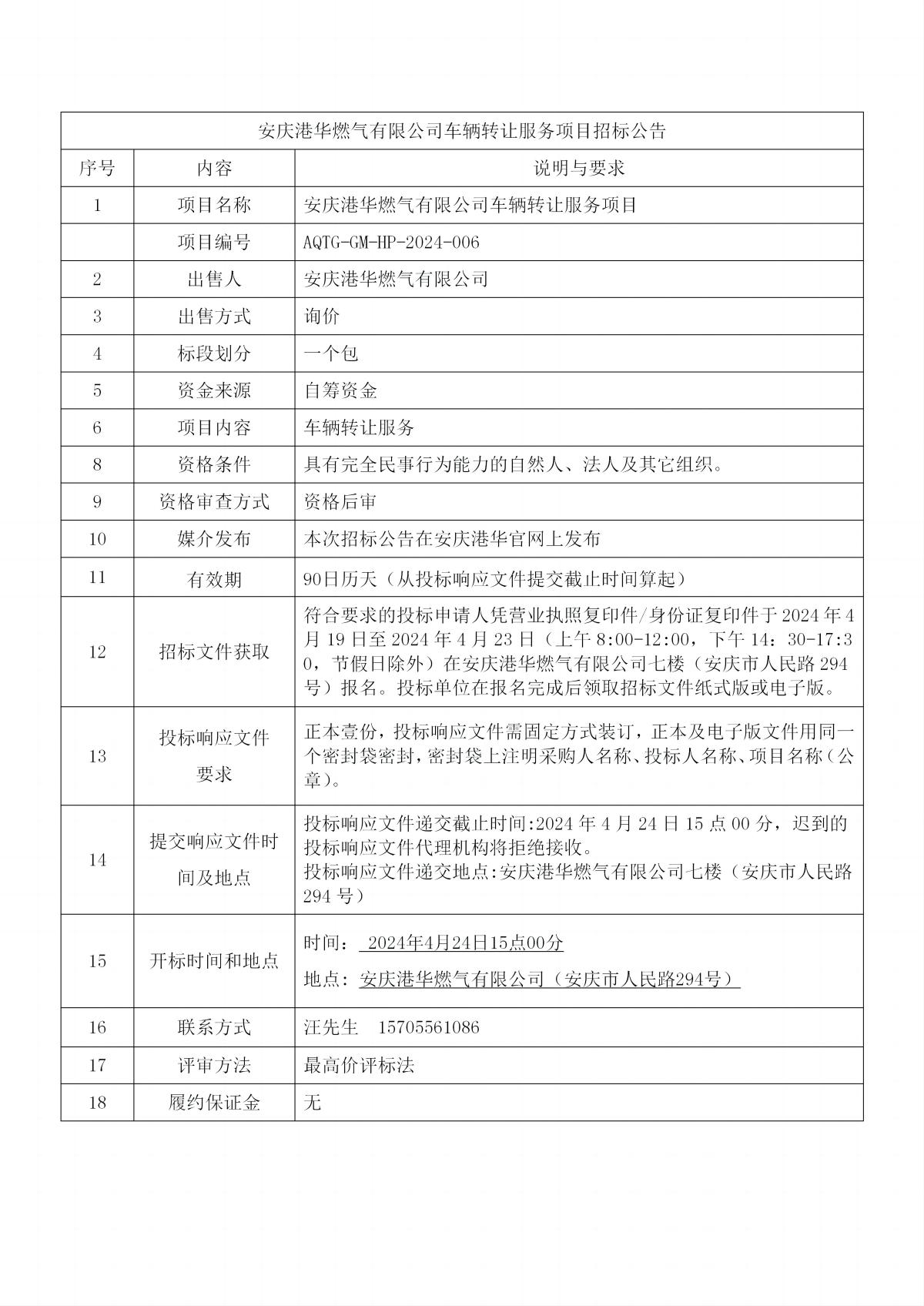 安慶港華燃氣有限公司車輛轉讓服務項目招標公告