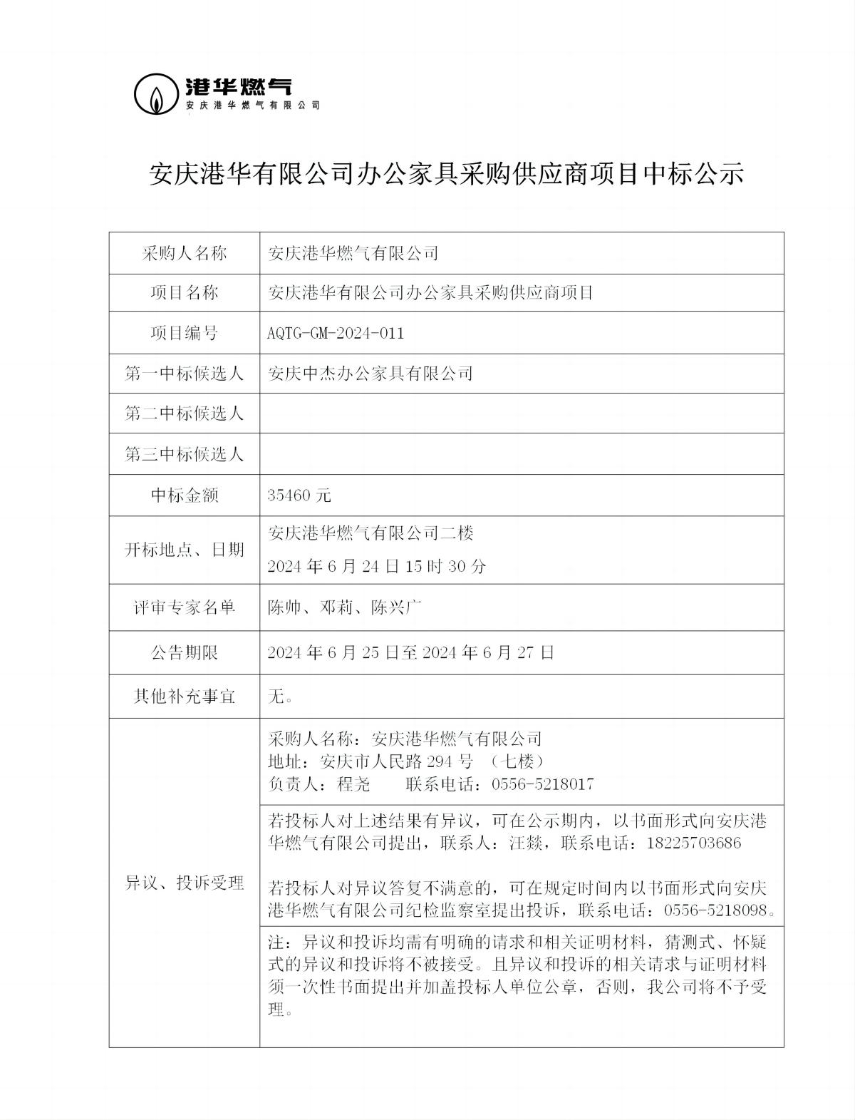 安慶港華有限公司辦公家具采購(gòu)供應(yīng)商項(xiàng)目中標(biāo)公示