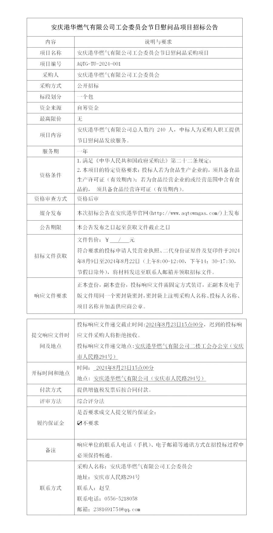 安慶港華燃?xì)庥邢薰竟瘑T會節(jié)日慰問品項目招標(biāo)公告