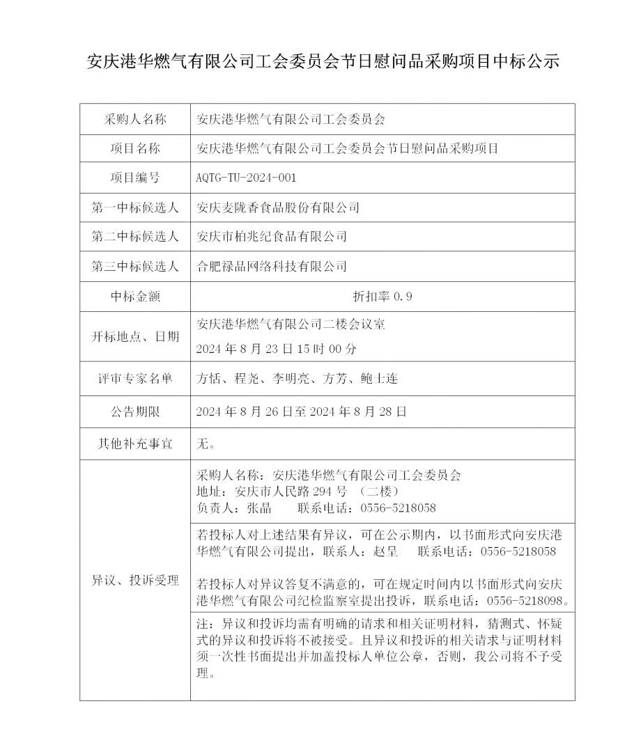 安慶港華燃?xì)庥邢薰竟?huì)委員會(huì)節(jié)日慰問品采購項(xiàng)目中標(biāo)公示