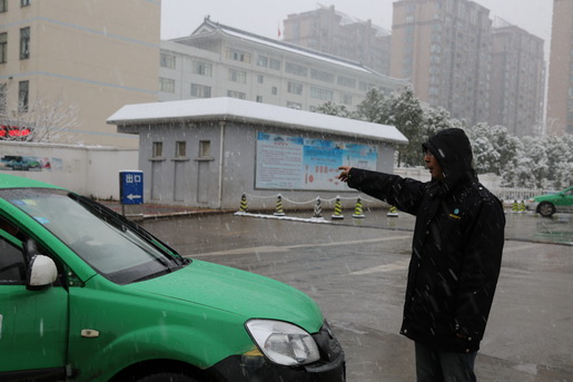 圖為加氣站工作人員在大雪中疏導(dǎo)加氣車輛有序加氣。