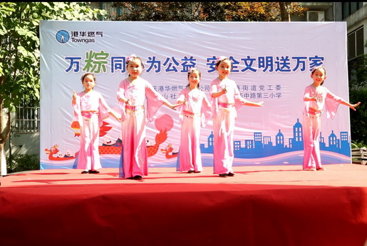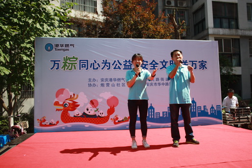 當(dāng)日,安慶港華的義工隊(duì)員和“藍(lán)焰”黨員義工們早早來到炮營山社居委轄區(qū)的諧水灣小區(qū),撐帳篷,搭展臺,搬物料,一場以“包粽子、看演出、講安全、傳文明”為主題的文化大餐陸續(xù)上演?;顒蝇F(xiàn)場熱鬧非凡,不少用戶正在港華燃?xì)獾摹傲鲃臃?wù)車”前排隊(duì)進(jìn)行燃?xì)鈭?bào)裝和繳費(fèi),服務(wù)臺的工作人員一邊發(fā)放著燃?xì)獍踩麄魇謨?,一邊針對居民的用氣問題耐心作答。而廣場正中央搭建的演出舞臺更是吸引不少居民駐足圍觀,安慶港華燃?xì)夂蜕鐓^(qū)居民聯(lián)合打造的精彩紛呈的文藝表演正在進(jìn)行。既有優(yōu)揚(yáng)的港華企業(yè)歌曲,又有優(yōu)雅的服務(wù)禮儀表演;社區(qū)阿姨們的廣場舞,舞出了歡樂,舞出了自信,來自轄區(qū)學(xué)校孩子們有模有樣的黃梅戲表演,讓我們看到了傳統(tǒng)戲曲文化的美好傳承;穿插其間的燃?xì)獍踩R有獎(jiǎng)問答更是引得眾人踴躍參與,掌聲、歡呼聲此起彼伏。而臺下社區(qū)阿姨和港華義工在欣賞精彩文藝演出的同時(shí),還不忘巧手裹粽,不多會,桌上就擺滿了幾百只飄著粽葉香的愛心粽,既弘揚(yáng)了傳統(tǒng)文化,又增進(jìn)了企業(yè)和居民之間的感情,現(xiàn)場呈現(xiàn)出一片文明和諧,奮進(jìn)向上的氛圍。
